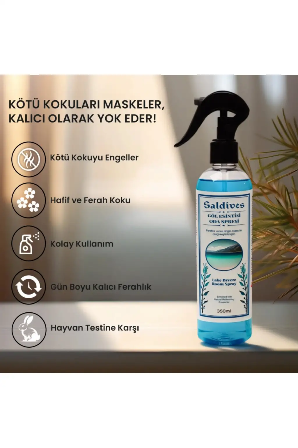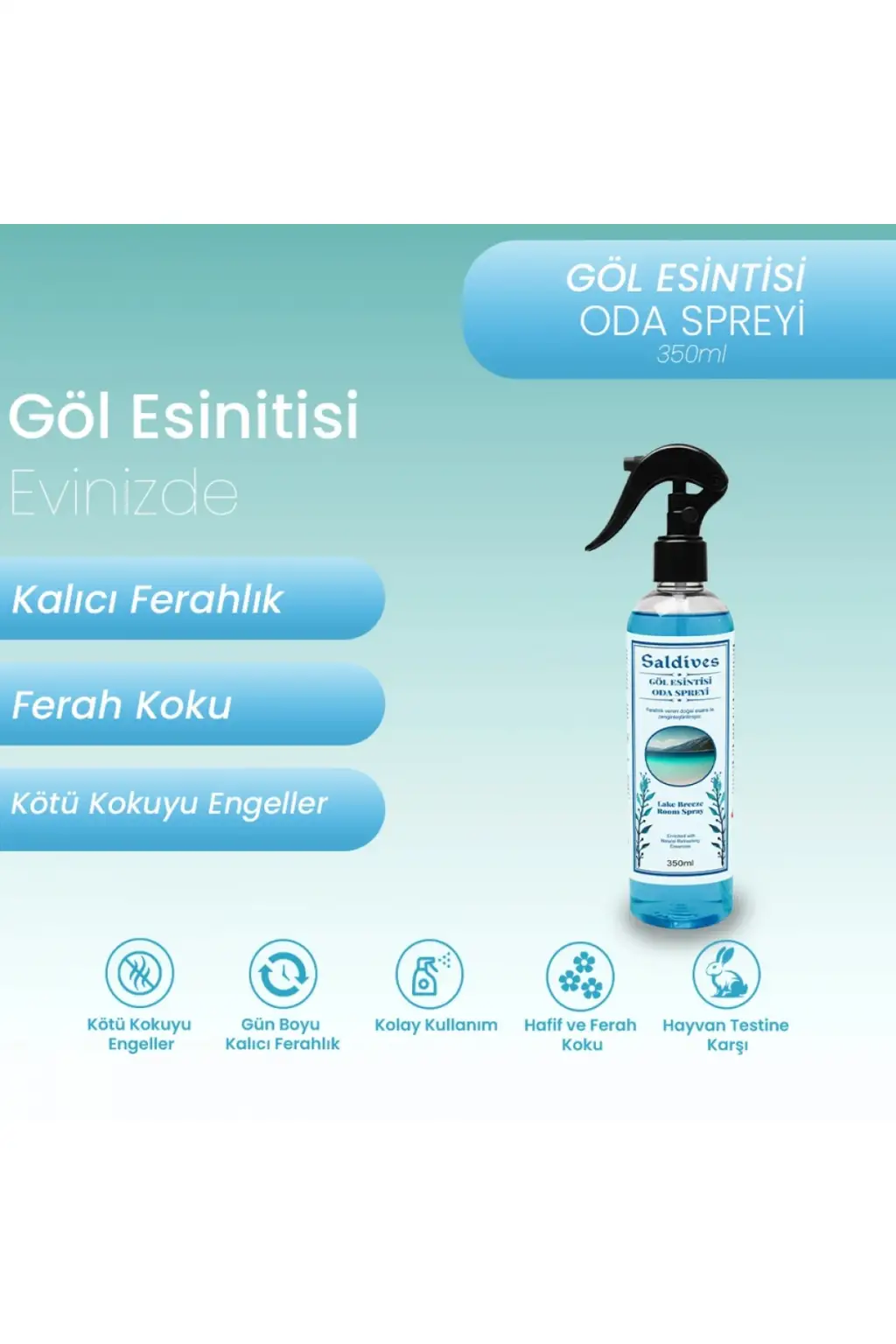 Göl Esintisi Oda Spreyi 350 ml, Saldives markası tarafından özenle hazırlanmıştır. Bu oda spreyi ile evinizde ferah ve huzurlu bir ortam yaratabilirsiniz. İçeriğindeki özel formül sayesinde hoş bir koku ve temiz bir hava sağlar. Göl Esintisi Oda Spreyi, uzun süre kalıcı etkiye sahiptir ve istenilen zaman kullanıma uygundur.
