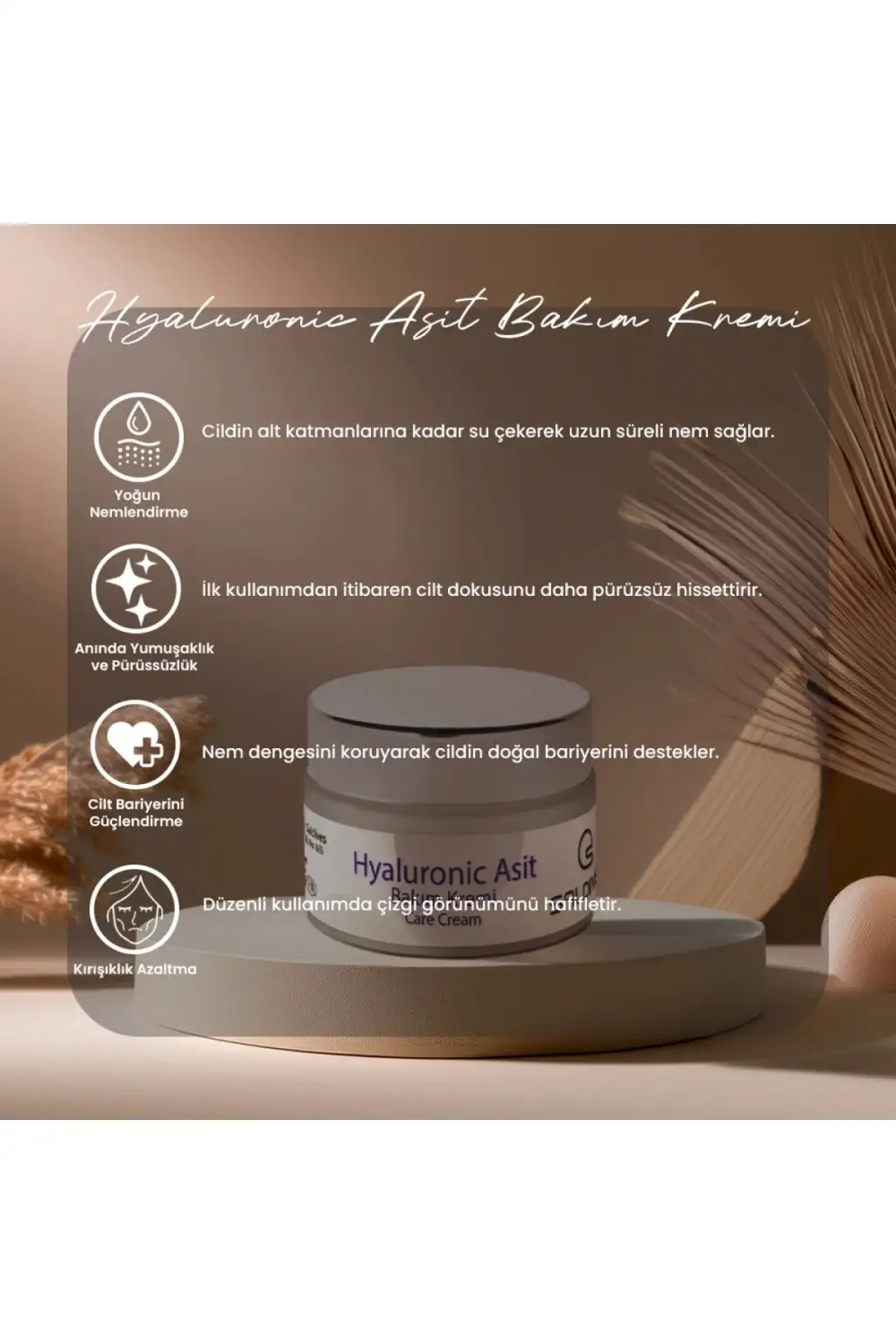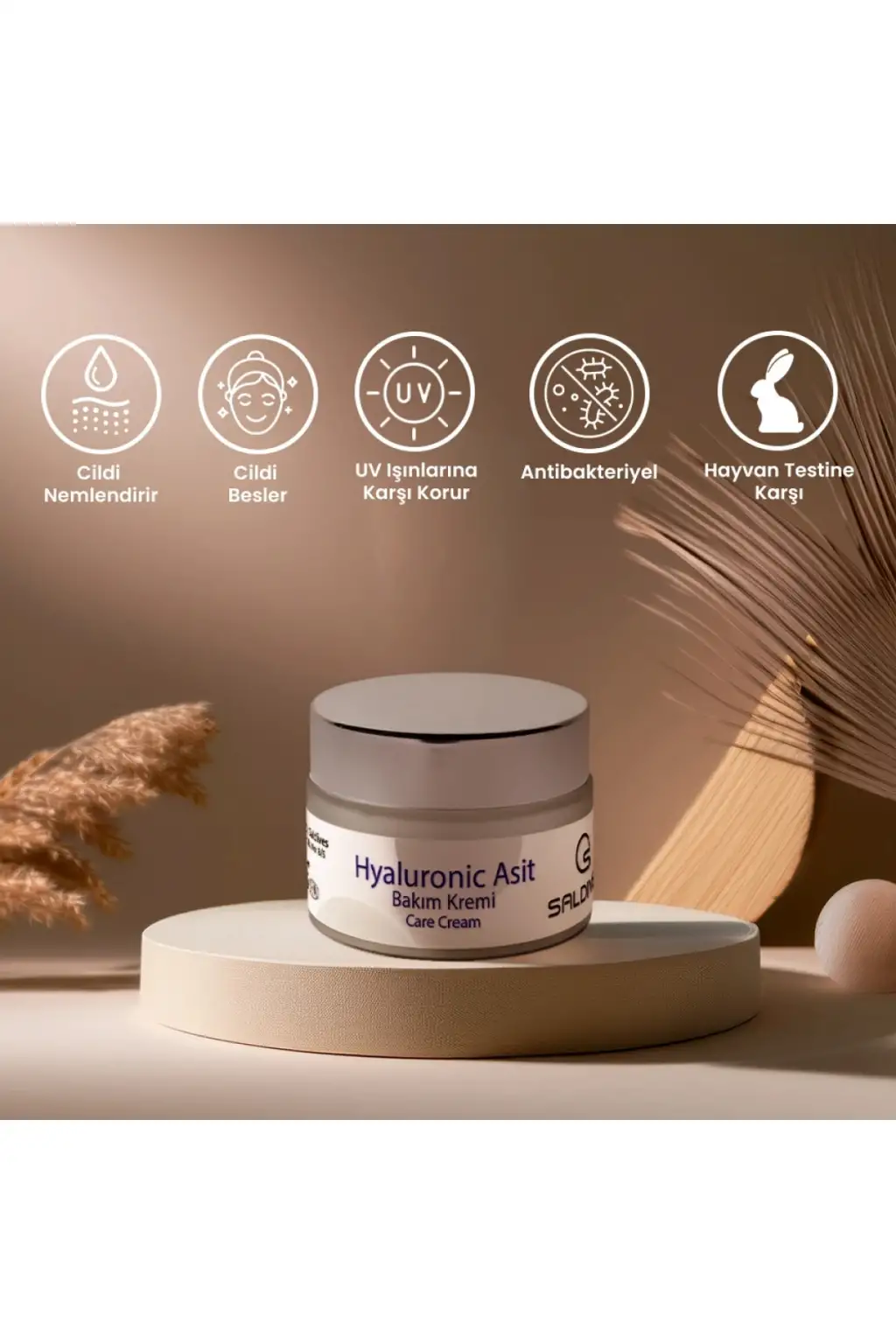 ÜRÜNLERİNİZİ İYİ GÜNLERDE KULLANINIZ.; Saldives Hyaluronic Yüz Kremi 50 ml, cildinizi nemlendirirken genç ve sağlıklı bir görünüm kazanmanıza yardımcı olur.; Özellikleri: Ciltteki nem kaybını önleyerek 24 saat boyunca nem dengesini korur.; Yoğun nemlendirici özelliği sayesinde cildi derinlemesine nemlendirir.; Hyaluronik asit içeriği cildin elastikiyetini arttırarak daha gergin bir görünüm sağlar.; Kolajen ile zenginleştirilmiş formülü sayesinde ciltteki kırışıklıkların görünümünü azaltmaya yardımcı olur.; Ciltte matlık ve cansızlık hissini giderir, cildinizi aydınlık ve canlı bir görünüme kavuşturur.; Hızlı emilim özelliği sayesinde yağlı bir his bırakmaz, cildinizi ağırlaştırmaz.;