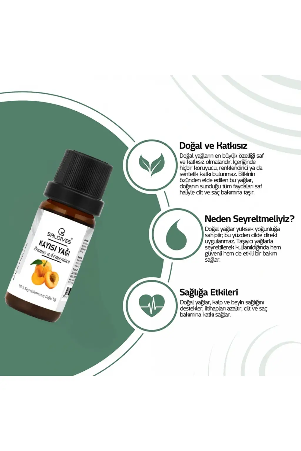 Saldives Kayısı Yağı 20 ml, cilt ve saç bakımında doğal bir üründür. İçeriğindeki doğal kayısı özü sayesinde cildi nemlendirir ve besler. Saçlara uygulandığında saç tellerini güçlendirir ve parlaklık kazandırır. Antioksidan özellikleri sayesinde cilt yaşlanmasını geciktirir ve saç derisini besler. Saldives Kayısı Yağı 20 ml'nin öne çıkan özellikleri şunlardır: