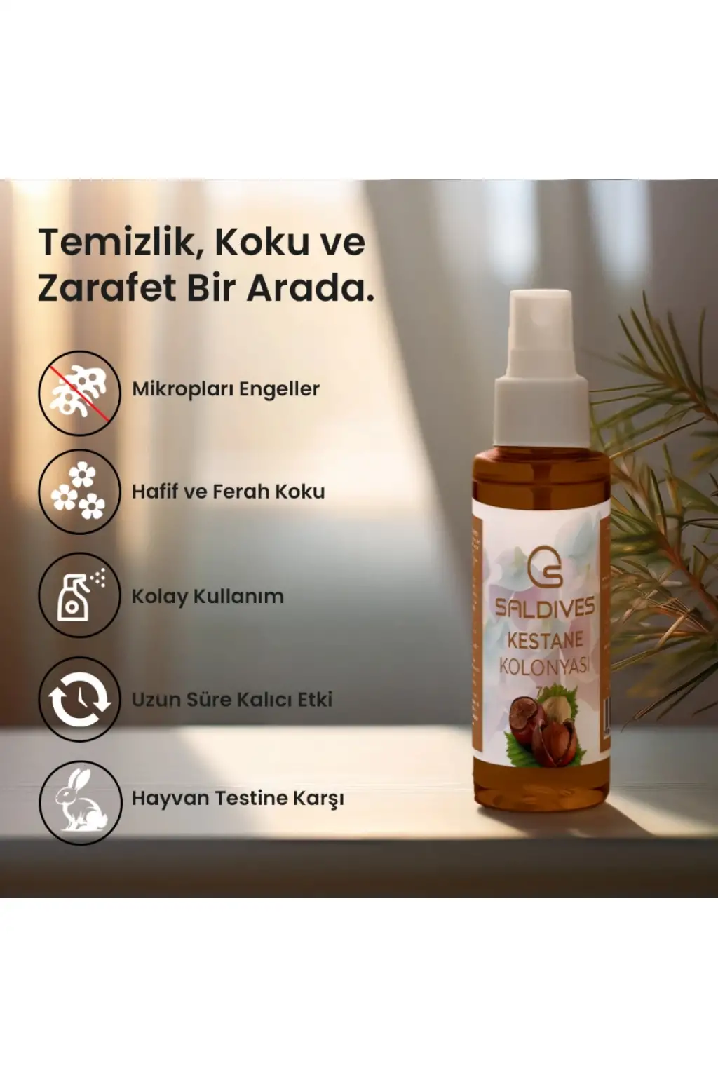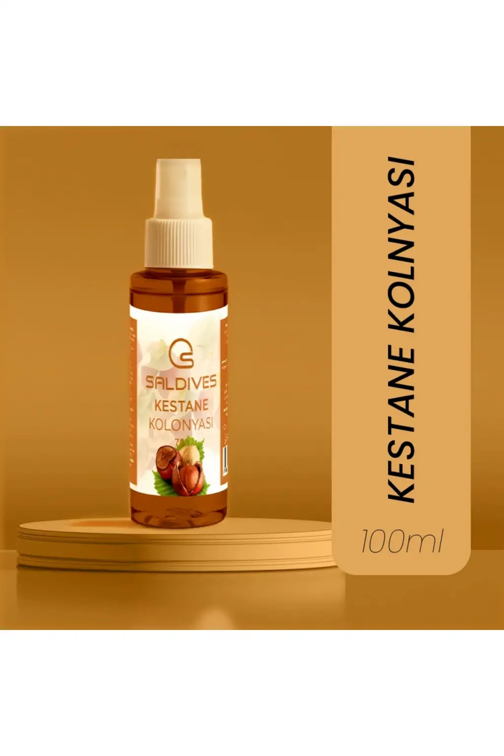 ÜRÜNLERİNİZİ İYİ GÜNLERDE KULLANINIZ.; ; Saldives markasının özel üretimi Kestane Kolonyası 100 ml, ferahlatıcı ve tazeleyici etkisiyle öne çıkıyor.; ; Doğal kestane özleri ile zenginleştirilen bu kolonya, cildi nazikçe temizlerken ferah bir his bırakır.; ; Özel formülü sayesinde gün boyu tazelik ve hijyen sağlar.; ; Pratik boyutuyla yanınızda taşımak için ideal bir seçenektir.; ; Ofis, seyahat ya da günlük kullanım için uygundur.; ; Saldives Kestane Kolonyası 100 ml, kaliteli içeriği ve hoş kokusuyla öne çıkarak günlük bakım rutininizin vazgeçilmezi olmaya aday!;