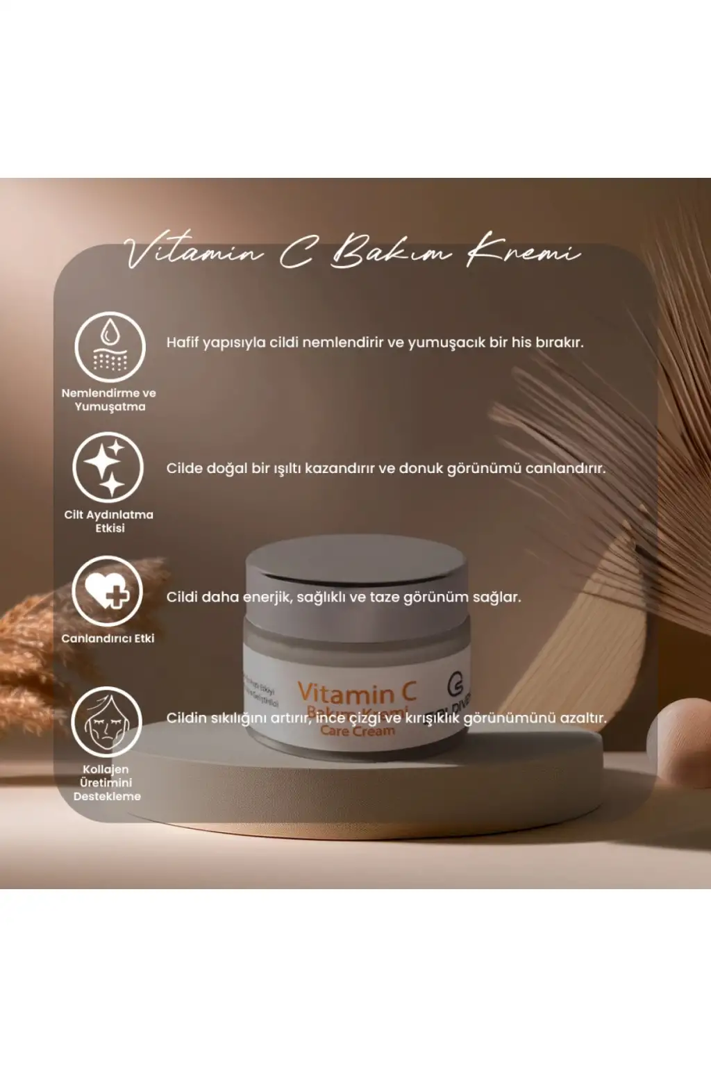 ÜRÜNLERİNİZİ İYİ GÜNLERDE KULLANINIZ.; Yeni Vitamin C Yüz Kremi, cildinizi beslerken aydınlık ve genç bir görünüm kazanmanıza yardımcı olur.; Özellikleri: Cildi besler ve nemlendirir.; Vitamin C içeriği sayesinde cildi güneşin zararlı etkilerine karşı korur.; Cilt tonunu eşitler ve lekelerin görünümünü azaltır.; Kolajen üretimini arttırarak cildin elastikiyetini ve sıkılığını destekler.; Cilde enerji verir, cansız bir görünümü canlandırır.; Cilt tipi fark etmeksizin herkesin kullanımına uygundur.; Sabah ve akşam temiz cilde masaj yaparak uygulayabilirsiniz.; Düzenli kullanımda daha sağlıklı ve parlak bir cilde kavuşabilirsiniz.; Vitamin C Yüz Kremi ile cildinizdeki farkı siz de hissedeceksiniz!